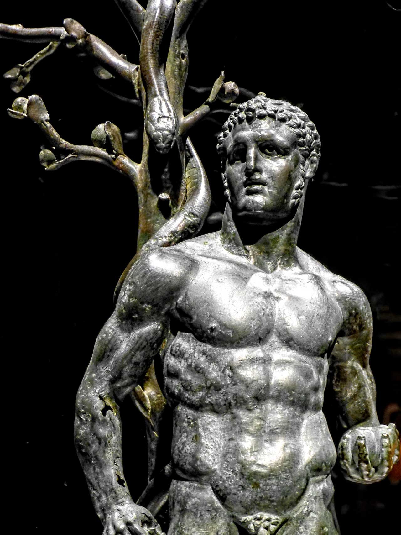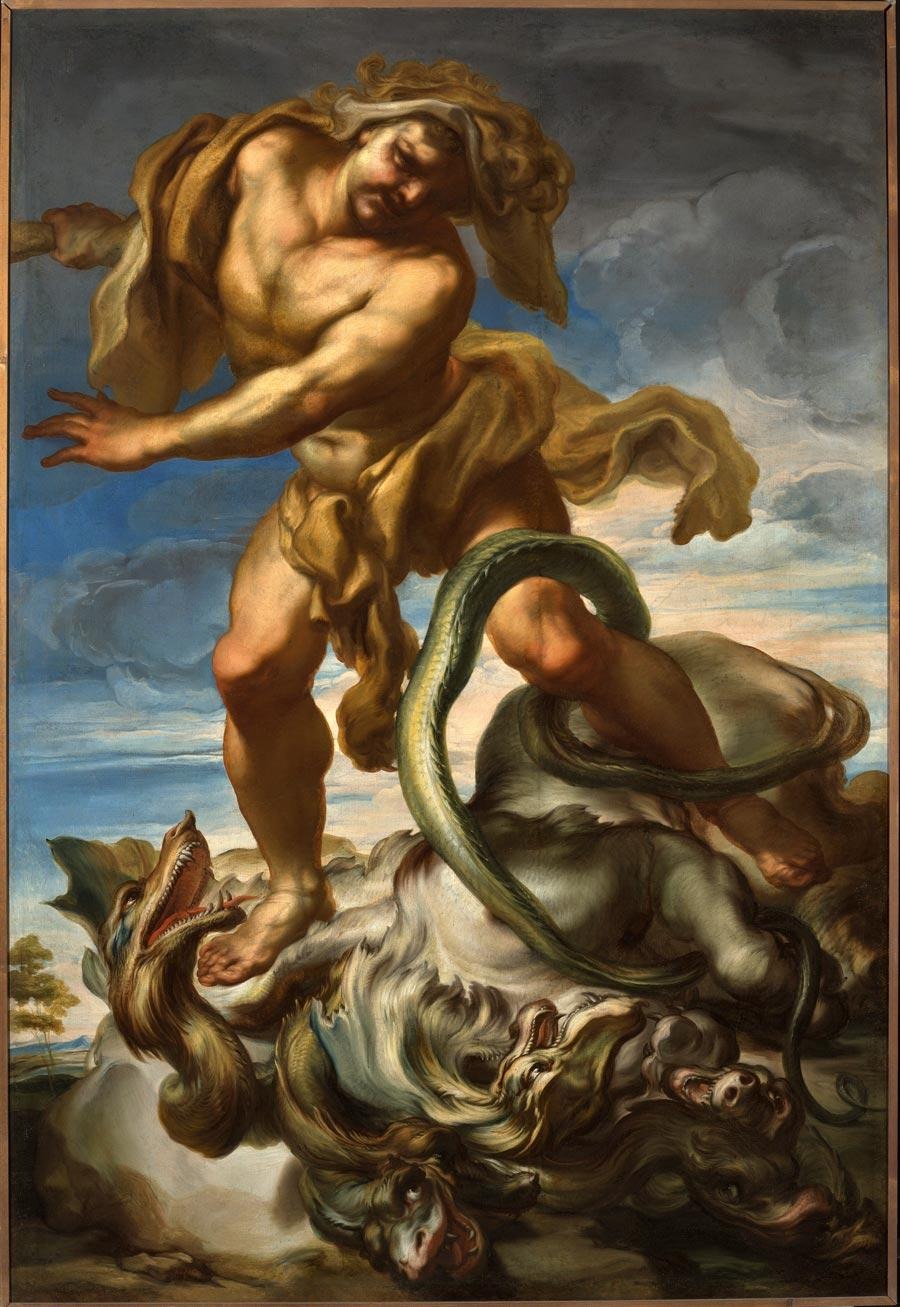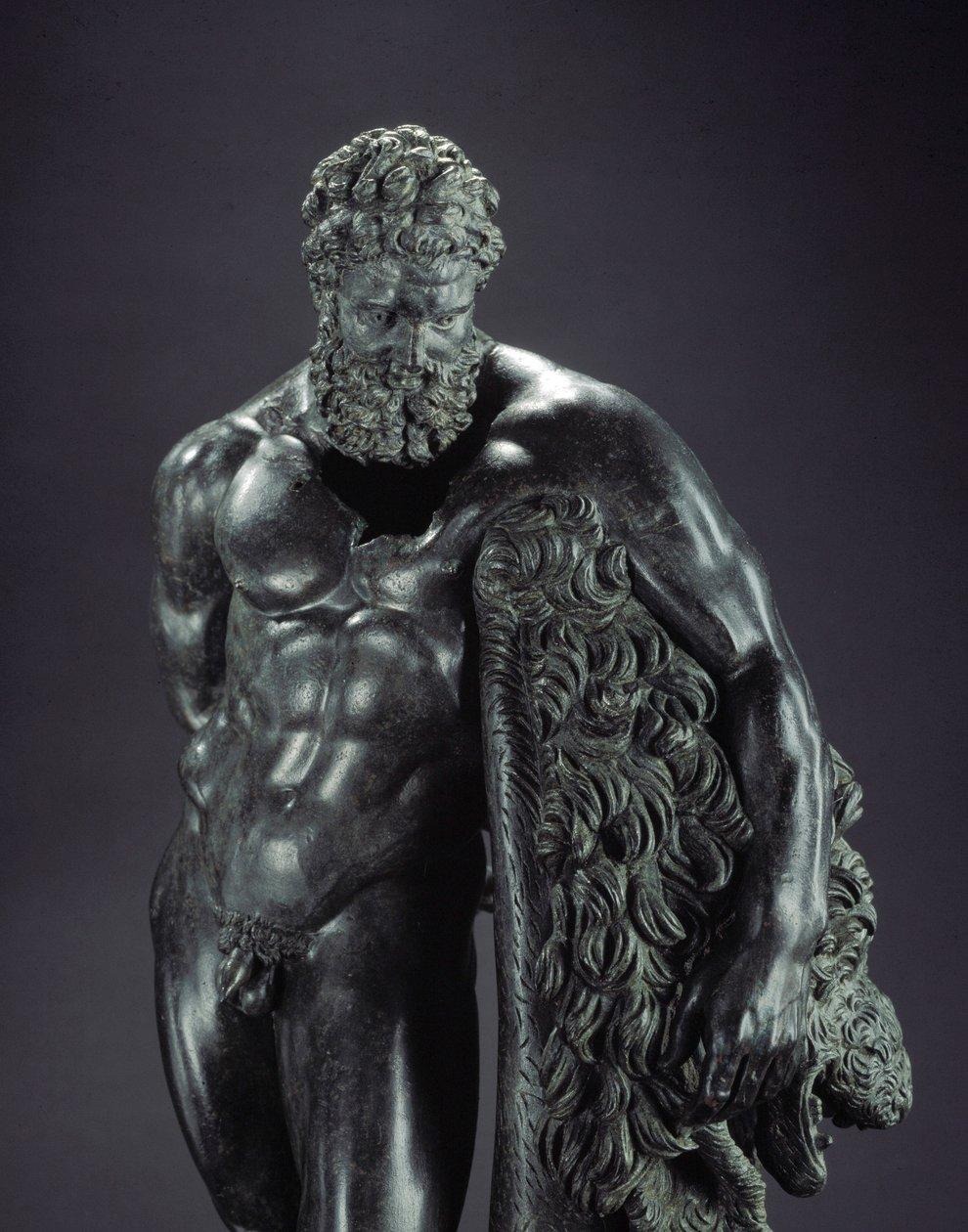 Un corpo imponente, pronto al movimento, all’azione, al balzo, agile come quello di un predatore, abitato da una forza smisurata. Lo copre una pelle leonina, la celebre leontè: sono le spoglie del leone di Nemea, che ha strangolato con le braccia possenti e scuoiato con i suoi stessi artigli. Questa pelle, che è insieme alla clava il suo segno distintivo, addita il mondo ferino di cui è trionfatore ma di cui, anche, in qualche modo partecipa. Uccisore di bestie mostruose, qualcosa di bestiale, di indomabile, accompagna il tormentato corso della sua vita.